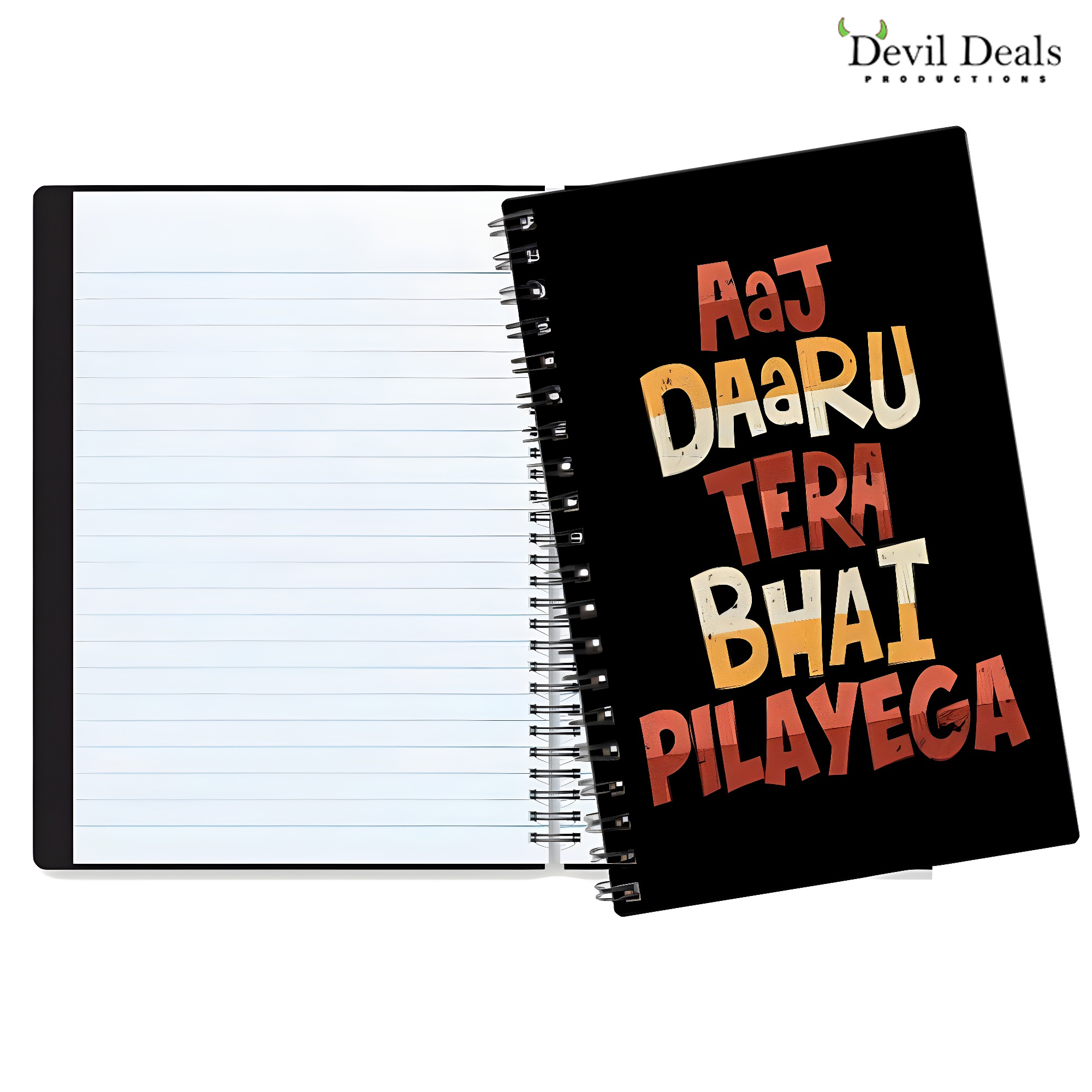 Spiral Notebook Diary A5 200 Pages – Aaj Daaru Tera Bhai Pilayega  are best for collage and School Students With funny lines and designs on these diaries would woo everyone around