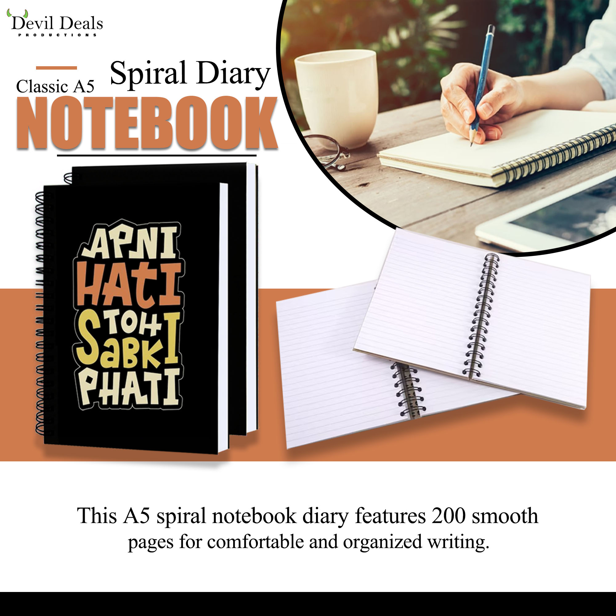 Spiral Notebook Diary A5 200 Pages – Apni Hati To Sabki Fati. The notebooks are 148 x 210 mm in size A5 Size