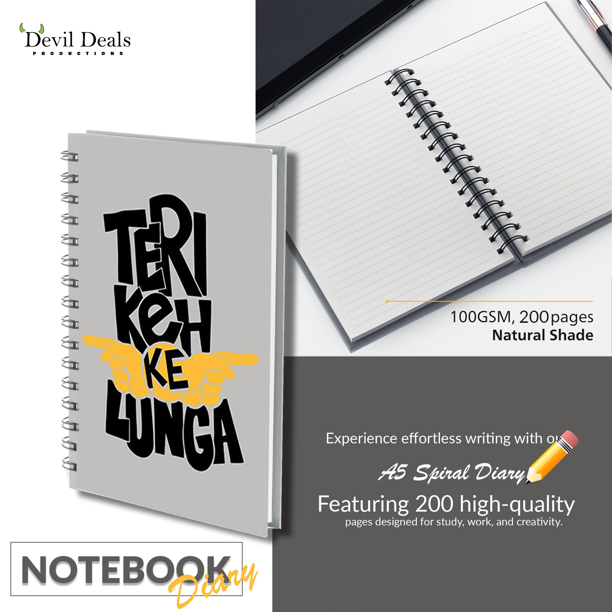 Spiral Notebook Diary A5 200 Pages – Teri Keh Ke Lunga are best for collage and School Students With funny lines and designs on these diaries would woo everyone around